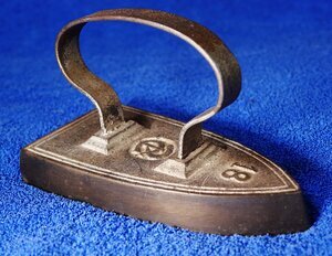 Spitz zulaufendes Flachbügeleisen mit angegossenem Eisenbügel im Rheinischen Stil. An der Spitze befindet sich als Größenangabe die Zahl "18". Zwischen den beiden Bügelbefestigungen befindet die einem Kreis eingelassen Initialen P C. Die beiden Buchstaben sind ineinander verschlungen. Die hinten gerundete Bügelsohle zeichnet es das Eisen als Glanzbügeleisen zum Bügeln von hohen Krägen, Batistblusen etc. aus. Es handelt sich um ein einfaches Flacheisen, das auf der Herdplatte oder an einem Bügeleisenofen erhitzt werden musste. Das Flachbügeleisen gehört zu den massiven Volleisen, die aus Eisen oder Stahlgeschmiedet oder gegossen und bereits ab dem 18. Jh. hergestellt wurden. Auf Grund seiner flachen Sohle, die nahezu mühelos über die vorher mit Wasser besprengte Wäsche gleitet, erfreute es sich noch weit bis ins 20. Jahrhundert hinein großer Beliebtheit. Das Erhitzen auf dem Kohleofen oder in einer offenen Feuerstelle wie dem Kaminfeuer erforderte jedoch verschiedene Vorsichtsmaßnahmen, um die Bügelwäsche nicht zu beschmutzen oder sich am fest verbundenen Metallgriff zu verbrennen. Viele Büglerinnen wischten daher nach dem Erhitzen des Eisens mit einem Tuch, das sie an ihrer Schürze befestigt hatten, über die Bügelsohle. Als Hitzeschutz wurde oftmals ein dicker Handschuh oder ein Lappen, der um den Griff gewickelt wurde, verwendet.