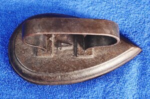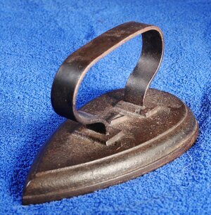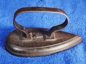 Flacheisen in Herzform (auch Harzer Form genannt) mit angegossenem Bandeisengriff und kanneliertem Rand. Keine Angaben zum Hersteller. Bügel in der rheinischen Form. Zwischen den Bügelstützen befindet sich erhaben die Ziffer 4. Wahrscheinlich die Größenangabe oder die Modellnummer. Es ist ein einfaches kleines Flacheisen, das auf der Herdplatte oder an einem Bügeleisenofen erhitzt werden musste. Das herzförmige Flachbügeleisen gehört zu den massiven Volleisen, die aus Eisen oder Stahlgeschmiedet oder gegossen und bereits ab dem 18. Jh. hergestellt wurden. Auf Grund seines geringen Gewichts und seiner flachen Sohle, die nahezu mühelos über die vorher mit Wasser besprengte Wäsche gleitet, erfreute es sich noch weit bis ins 20. Jahrhundert hinein großer Beliebtheit. Das Erhitzen auf dem Kohleofen oder in einer offenen Feuerstelle wie dem Kaminfeuer erforderte jedoch verschiedene Vorsichtsmaßnahmen, um die Bügelwäsche nicht zu beschmutzen oder sich am fest verbundenen Metallgriff zu verbrennen. Viele Büglerinnen wischten daher nach dem Erhitzen des Eisens mit einem Tuch, das sie an ihrer Schürze befestigt hatten, über die Bügelsohle. Als Hitzeschutz wurde oftmals ein dicker Handschuh oder ein Lappen, der um den Griff gewickelt wurde, verwendet.