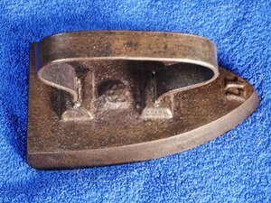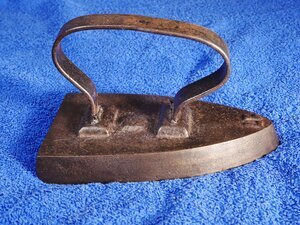 Das vorliegende Bügeleisen ist ein so genanntes Flacheisen aus Gusseisen und besitzt einen angegossenen Bügel in rheinischer Form. Etwa in der Mitte der Oberfläche des Eisens zwischen den Befestigungen der Bügelstützen befindet sich eine Gussmarke. In deren Wappenschild sind sehr schwer erkennbare ineinander verschlungene Initialen - vielleicht C und A eingeschlossen. An der Spitze des Eisens findet sich die Zahl 17, möglicherweise eine Größenangabe. Die Kante hinten unten ist abgerundet. Somit ist das Eisen auch ein Glanzbügeleisen. Bügeleisen werden seit dem 17. Jahrhundert zum Glätten der Wäsche verwendet. Die ersten Bügeleisen bestanden aus einer Metallplatte und einem bügelartigen Griff. Daher auch der Name. Flacheisen wurden in Privathaushalten auf der Herdplatte, in gewerblichen Betrieben auch auf speziellen Bügeleisenöfen erhitz. Das Bügeleisen konnte dann so lange es heiß war zum Glätten der vorher mit Wasser eingesprengten Wäsche verwendet werden. Wurde das Eisen auf oder in einem Kohleofen erhitzt, musste es zuerst von Kohleresten gereinigt werden. War das Eisen zu sehr abgekühlt, musste es gegen ein gerade aufgeheiztes Exemplar ausgetauscht werden. D.h. zum kontinuierlichen Bügeln waren mehrere Bügeleisen vonnöten.