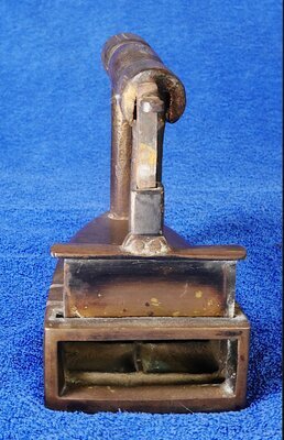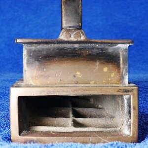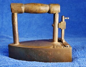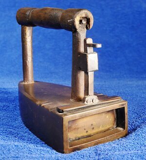 Flachbolzenbügeleisen (Kastenbügeleisen, Reisebügeleisen) aus Messing mit schiffförmigem Rumpf. In den Rumpf kann ein erhitzter Bolzen von hinten eingeführt werden. Mit diesem wird der Boden des Bügeleisens erhitzt. Der Innenraum kann mit einem von oben eingeführten Schieber mit Stiel und Griff verschlossen werden, sodass der Eisenkeil nicht nach hinten herausfallen kann. Hierzu befindet sich am hinteren breiten Ende die Schiebeklappe, die vertikal beweglich ist, um den heißen Bolzen einrühren zu können. Der hölzerne Griff ist mit 2 relativ langen Säulen aus Messing mit dem eigentlichen Bügeleisen verbunden. Im Inneren befinden sich unten längs und quer laufende Rippen die verhindern, dass der Eisenkeil direkt auf dem Boden aufliegt. Der Bolzen ist leider nicht mehr vorhanden. Die Oberseite des Bügeleisens besitzt an den Rändern keilförmige Markierungen.