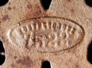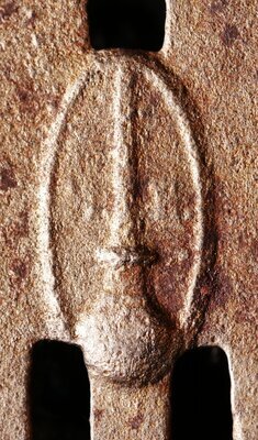 Auf 3 nach außen stehenden Füßchen stehender Bügeleisenuntersetzer mit Griff und abstrakten Dekor zum Abstellen eines auch heißen Bügeleisens normaler Größe. An der Unterseite befinden sich 2 Gussmarken. Die obere ist das Markenzeichen des Eisenhüttenwerks Mägdesprung. Die untere beinhaltet oben eine nicht lesbare Schrift und darunter die Zahl 7522 (siehe Abbildungen).