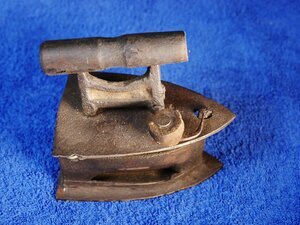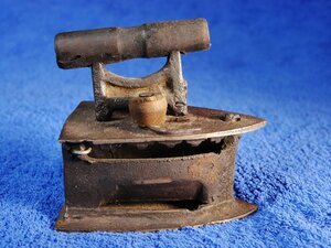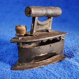 Miniaturversion eines Kohlenbügeleisens. Anstatt Augen besitzt dieses Eisen je einen augenänlichen Schlitz an den Seitenwänden über der Bodenplatte. Die der Holzgriff ist schief und geht Richtung Spitze des Eisens nach oben. Die Griffstütze ist mit 2 nicht originalen Schrauben befestigt. Der Rost ist nicht mehr vorhanden. Der Deckel wird mit einem Hakenverschluss mit Holzknauf verschlossen. Das Bügeleisen weist sehr viele Gebrauchsspuren auf ist wäre mit einem neuen Rost jedoch noch einsatzfähig.