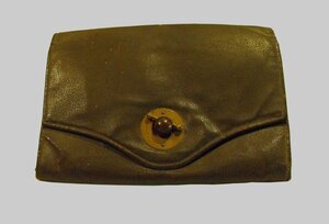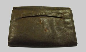 Braune Ledertasche mit einer strukturierten Oberfläche, die auf das Material Leder hinweist. Die Außenhülle besteht aus einem Stück. Zum Aufklappen ist sind Dreiecke an den Seiten eingesetzt, so dass die Tasche im 45 Gradwinkel aufklappbar ist. Innen ist sie mit einen feinmaschigen hellen Stoff ausgekleiset und auf der Innenrückseite sind vier unterschiedlich breite Fächer aufgenäht. Es gibt einen kreisförmigen, goldfarbenen Verschluss in der Mitte mit einem dunkleren kugelförmigen Knopf in der Mitte, um den Überwurf der Tasche zu sichern. Die Kanten der Tasche sind glatt verarbeitet und Außenhülle, Innenfutter und Seitendreiecke sind miteinander vernäht. Rückseitig ist ein 200 x 15 mm Band aus braunem Leder in die Außenhülle eingelassen.