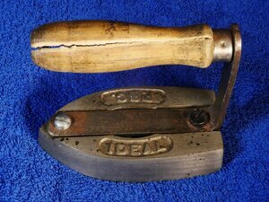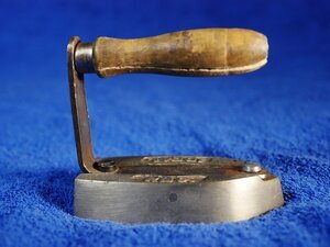 Das kleine Bügeleisen war einmal der Body eines Spielzeuig-Satzeisens. Bei Satzeisen können mit einem Griff und einem Klemmmechanismus mehrere Eisen abwechselnd mit dem Griff benutzt und dann wieder zum Erhitzen abgestellt werden. Möglicherweise ist der Griff verloren gegangen und es wurde über die Schiene und die Halterung für den Griff ein Metallband mit einem neuem einfachen Griff geschraubt, sodass mit dem Body zwar wieder gebügelt werden, dieser aber nicht mehr als Satzeisen genutzt werden kann. Satzeisen gehen auf ein amerikanisches Patent aus dem Jahre 1871 zurück. Sie besitzen eine mit Asbest isolierte Bügeleisendecke und einem ausklinkbaren Holzgriff den man auf auf eines der meist 4 Eisen klemmen konnte. Im Laufe der Zeit entwickelten die Hersteller viele verschiedene Klemmmechanismen. Vor dem Bügeln wurde das Eisen auf einem Herd erhitzt und anschließend der Holzgriff aufgesetzt, um die Wäsche zu glätten.