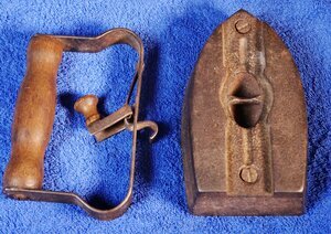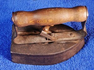 Kleines Satzeisen, möglicherweise ein Kinderbügeleisen, mit dazugebasteltem Bügel. Der Bügel ist nicht mehr der originale - möglicherweise wurde für dieses Eisen ein zusätzlicher Bügel gebraucht. Dieser besteht aus einem Metallband und einem gedrechselten Holzgriff. An seiner Unterseite befindet sich ein nicht mehr funktionsfähiger einfacher Einhak-Mechanismus. Das Metallband ist deutlich schmaler als der Kanal für den Griff im Body. Satzeisen gehen auf ein amerikanisches Patent aus dem Jahre 1871 zurück. Sie besitzen eine mit Asbest isolierte Bügeleisendecke und einem ausklinkbaren Holzgriff den man auf auf eines der meist 4 Eisen klemmen konnte. Im Laufe der Zeit entwickelten die Hersteller viele verschiedene Klemmmechanismen. Vor dem Bügeln wurde das Eisen auf einem Herd erhitzt und anschließend der Holzgriff aufgesetzt, um die Wäsche zu glätten.