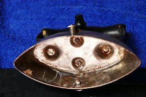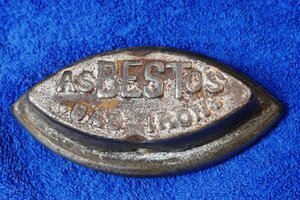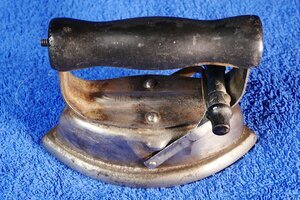 Kleines Bügeleisen. Das Gerät besteht aus 2 Teilen: dem Kern aus vernickeltem Gusseisen und der Haube mit Halterungen aus vernickeltem Eisenblech für den schwarzen Holzgriff. Es hat wie für amerikanische Bügeleisen aus dieser Zeit üblich vorne und hinten eine Spitze. Ein außen an beiden Seiten der Haube befestigter Hebel mit Holzgriff ermöglicht es 2 Bolzen in Aussparungen des Kerns zu schieben und so die beiden Teile miteinander zu verbinden bzw. wieder zu trennen. Auf der Bügelhalter ist die Zahl 1900 eingeschlagen, daneben stand verkratzt und nicht mehr lesbar. Bei einem Vergleichsobjekt steht hier das genaue Datum. Auf dem Kern steht in erhabener Schrift ASBESTOS SAD IRON. Das Besondere dieses Bügeleisens ist es, dass das heiße Eisen durch eine Asbestschicht geschützt ist und so die Hitze nicht an die Hand der Büglerin gelangen kann. Als angenehmer Nebeneffekt kühlt es nicht so schnell aus und kann länger zum Bügeln verwendet werden. Die Haube war innen an der Decke und den Seitenwänden mit Asbest ausgekleidet oder es wurde vor der Benutzung des Bügeleisens eine dünne Asbestmatte auf und um den Kern gelegt und die Haube darübergestülpt. Damit war die Hand der Büglerin geschützt. Nicht mehr vorhanden sind weitere Kerne die zum Wechseln verwendet wurden und die asbesthaltige Abstellplatte für dieses Bügeleisen. Problematisch war die Belastung der Büglerinnen durch die krebserregenden Asbestfasern. Obwohl Asbestose als Krankheit seit 1900 bekannt war, wurden hierbei die Büglerinnen einem deutlich erhöhten Lungenkrebsrisiko durch die winzigen Asbestfasern ausgesetzt Der Hersteller des Eisens war die 1893 gegründete Tverdahl-Johnson Company in in Stoughton, Wisconsin. 1900 wurde diese nach Dover, Ohio verlagert und in Dover Manufacturing Company umbenannt. Nach anfänglichen Schwierigkeiten bei der Patentzuteilung wurde am 22.Mai 1900 das erste Patent und danach weitere Patente für die verwendeten Technologien mehrere Patente erteilt. Das Bügeleisen war in verschiedenen Größen und mit verschiedenem Zubehör erhältlich und wurde zu Hunderttausenden von diesem einen Hersteller produziert. Der Niedergang begann mit der bald darauf einsetzenden Elektrifizierung und dem Aufkommen der deutlich unproblematischer zu bedienenden Elektrobügeleisen. Wohl auch deshalb blieb die Verbreitung weitgehend auf die USA beschränkt.