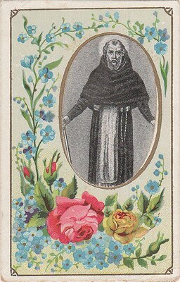 Auf der Vorderseite das Bild des Heiligen in einem ovalen Kreis, der unten und links von rankenden Blumen flankiert wird. Auf der Rückseite ist das Gebet an den Heiligen abgedruckt: Gebet - Erhöre uns, o Gott, und verleihe und gnädiglich, daß Beispiel Deines hl. Jodokus ermuntert, den Weg zu Die eifrig zu wandeln mögen. Durch Christus unseren Herrn. Amen. - St. Jodokus