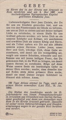 Gebets- und Ablasskarte zum hl. Kind von Aracoeli - Rom