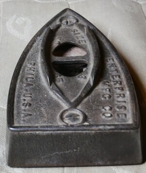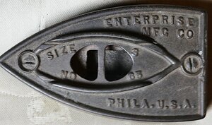 Eisen eines Satzeisens ohne Griff (der aktuell vielleicht auf einem anderen Eisen befestigt ist) Schifförmige Form. Der Deckel des Eisens ist mit zwei Schrauben auf der Unterlage befestigt. Etwas ungewöhlich für amerikanische Bügeleisen ist die Form mit nur einer Spitze. Aufschriften: ENTERPRISE MFG CO PHILA. USA SIZE 3 NO 65 Das Eisen wurde durch das Patent 240 geschützt