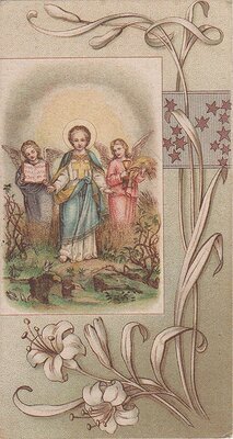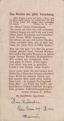 Auf der Vorderseite das Bild einer Heiligen, die von zwei Engel flankiert ist. Rechts über die gesammte Höhe ein Linienzwei und im oberen Teil ein Band mit Sternen. Die Rückseite ist ein Gebet mit der Überschrift "Das Walten der göttl. Vorsehung". Unter dem Gebet steht handschriftlich: "Zum Gedenken Pater Mem. M. Zorn Missionär".