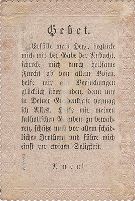 Auf der Vorderseite das Bild des Jesuskindes, dass ein einen Kelche mit der hl. Hostie zeigt. Der Rand ist gepägt und lilafarbend 10 mm breit. Die Rückseite ist ein Gebet abgedruckt. Klebereste auf der Rückseite deuten darauf, dass die Karte einmal aufgeklebt war.