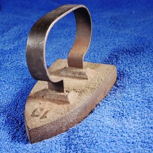 Das vorliegende Bügeleisen ist ein so genanntes Flacheisen aus Gusseisen und besitzt einen angeschweißten Bügel in rheinischer Form. An der Spitze des Eisens findet sich als Größenangabe die Zahl 16, (fast) die Länge in cm. Die Kante hinten unten ist abgerundet. Somit ist das Eisen auch ein Glanzbügeleisen. Das Eisen besitzt eine sehr raue Oberfläche. Bügeleisen werden seit dem 17. Jahrhundert zum Glätten der Wäsche verwendet. Die ersten Bügeleisen bestanden aus einer Metallplatte und einem bügelartigen Griff. Daher auch der Name. Flacheisen wurden in Privathaushalten auf der Herdplatte, in gewerblichen Betrieben auch auf speziellen Bügeleisenöfen erhitz. Das Bügeleisen konnte dann so lange es heiß war zum Glätten der vorher mit Wasser eingesprengten Wäsche verwendet werden. Wurde das Eisen auf oder in einem Kohleofen erhitzt, musste es zuerst von Kohleresten gereinigt werden. War das Eisen zu sehr abgekühlt, musste es gegen ein gerade aufgeheiztes Exemplar ausgetauscht werden. D.h. zum kontinuierlichen Bügeln waren mehrere Bügeleisen vonnöten.