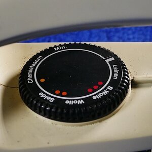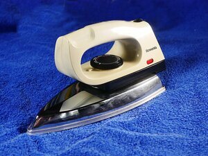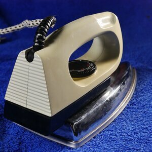 Elektrobügeleisen mit Thermostat der Firma Rowenta. Das Eisen besteht von unten nach oben aus einer Stahlplatte, einer Kuppel aus Stahlblech, die die Heizungsanlage umschließt, einen Drehregler für den Thermostat mit der die Temperatur eingestellt werden kann und einem zweifarbig schwarz-weißem Griff aus Kunststoff. Der Thermostat hat Einstellmöglichkeiten für Min., Chemiefasern, Seide, Wolle. B.Wolle, Leinen, Auf der linken Seite des Griffs ist ein Lämpchen integriert, das leuchtet, wenn das Eisen heiß oder am Aufheizen ist. Das Bügeleisen besitzt ein ca 2 m langes Anschlusskabel. Unter dem vorstehenden Griff ist am hinteren Ende das Typenschild mit folgendem Inhalt angebracht: Rowenta Typ LA-33 1200W 220V VDE Zu dem Bügeleisen konnte der von der Firma Schulte produzierte Dampfuntersatz Dampf-Boy verwendet werden.