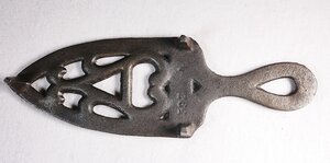Auf 3 Füßchen stehender sehr kleiner Bügeleisenuntersetzer für die Puppenküche mit durchbrochenem Griff für ein Kinderbügeleisen. Abstraktes durchbrochenes Dekor. Auf der Unterseite Punze mit der Zahl 592. Keine Hinweise auf den Hersteller. Möglicherweise VEB Eisenwerk Erla.