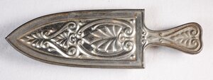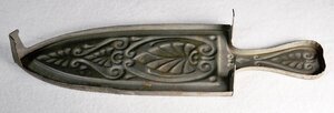 Auf 3 Füßchen stehender sehr leichter Untersetzer mit geprägtem Renaissancedekor für ein Kinderbügeleisen aus der Zeit des Historismus. Keine Hinweise auf den Hersteller.