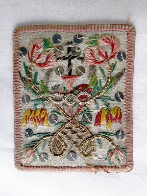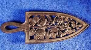 Auf 3 Füßchen stehender Untersetzer mit in Formen des Barock gestaltetem Griff für ein Kinderbügeleisen. abstraktes Dekor im eigentlichen Untersetzer. Künstlich erzeugte (?) Patina. Keine Hinweise auf den Hersteller.