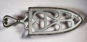 Auf 3 Füßchen stehender Untersetzer mit in Formen des Barock gestaltetem Griff für ein Kinderbügeleisen. abstraktes Dekor im eigentlichen Untersetzer. Keine Hinweise auf den Hersteller.