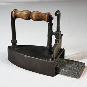 Miniatur Flachbolzenbügeleisen (Kastenbügeleisen, Reisebügeleisen) aus Bronze mit schiffförmigem Rumpf. In den Rumpf kann ein erhitzter Bolzen von hinten eingeführt werden. Mit diesem wird der Boden des Bügeleisens erhitzt. Der Innenraum kann mit einem von oben eingeführten Schieber mit Stiel und Griff verschlossen werden, sodass der Eisenkeil nicht nach hinten herausfallen kann. Hierzu befindet sich am hinteren breiten Ende die Schiebeklappe, die vertikal beweglich ist, um den heißen Bolzen einführen zu können. Der hölzerne Griff ist mit 2 relativ langen Säulen aus Messing mit dem eigentlichen Bügeleisen unten mit Schrauben verbunden. Der Bolzen ist vorhanden ist aber im Vergleich zum Innenraum relativ sehr klein. Das Holz des Griffs ist nachgedunkelt aber das Eisen zeigt keinerlei Gebrauchsspuren. Die Schraubenmutter der hinteren Säule benötigt fast die Hälfte des verfügbaren Raums in der Vertikalen. Größere Bolzen sind daher nicht einführbar. Das Objekt ist wohl als reines Deko-Objekt verkauft und benutzt worden.