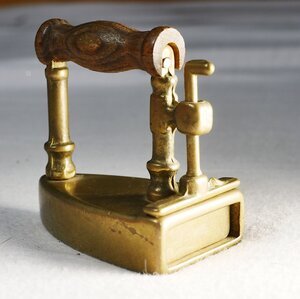 Miniatur Flachbolzenbügeleisen (Kastenbügeleisen, Reisebügeleisen) aus Messing mit schiffförmigem Rumpf. In den Rumpf kann theoretisch ein erhitzter Bolzen von hinten eingeführt werden. Mit diesem wird der Boden des Bügeleisens erhitzt. Der Innenraum kann mit einem von oben eingeführten Schieber mit Stiel und Griff verschlossen werden, sodass der Eisenkeil nicht nach hinten herausfallen kann. Hierzu befindet sich am hinteren breiten Ende die Schiebeklappe, die vertikal beweglich ist, um den heißen Bolzen einführen zu können. Der hölzerne Griff ist mit 2 relativ langen und unten verzierten Säulen aus Messing mit dem eigentlichen Bügeleisen unten mit Schrauben verbunden. Ein Bolzen ist nicht vorhanden. Das Holz des Griffs ist nachgedunkelt aber das Eisen zeigt keinerlei Gebrauchsspuren. Die Schraube der hinteren Säule benötigt nahezu die ganze Höhe des Innenraums sodass kein Bolzen in diesen eingeschoben werden kann. Das Objekt ist wohl als reines Deko-Objekt oder für die Puppenküche verkauft und dort benutzt worden.