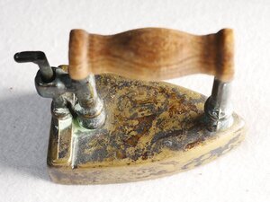 Miniatur Flachbolzenbügeleisen (Kastenbügeleisen, Reisebügeleisen) aus Messing mit schiffförmigem Rumpf. In den Rumpf kann ein erhitzter Bolzen von hinten eingeführt werden. Mit diesem wird der Boden des Bügeleisens erhitzt. Der Innenraum kann mit einem von oben eingeführten Schieber mit Stiel und Griff verschlossen werden, sodass der Eisenkeil nicht nach hinten herausfallen kann. Hierzu befindet sich am hinteren breiten Ende die Schiebeklappe, die vertikal beweglich ist, um den heißen Bolzen einführen zu können. Der hölzerne Griff ist mit 2 relativ langen und unten verzierten Säulen aus Messing mit dem eigentlichen Bügeleisen unten mit Schrauben verbunden. Ein Bolzen ist nicht vorhanden. Das Holz des Griffs ist nachgedunkelt. Das Objekt zeigt viel Patina. Es liegt die Vermutung nahe, dass diese absichtlich aufgetragen wurde um das Bügeleisen alt erscheinen zu lassen. Das Objekt ist wohl als reines Deko-Objekt oder für die Puppenküche verkauft und dort benutzt worden.