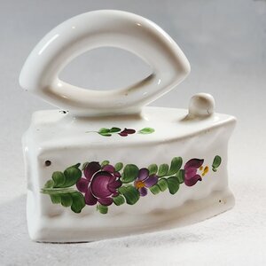 Mitbringsel aus Budapest in grober Form eines Mini-Kohle-Bügeleisens mit Amerikanischem Griff. Alles aus Keramik. Weiße Glasur. Auf auf einer Seite des "Deckels" die Aufschrift "Budapest" auf der anderen Blumendekor. An beiden Seiten Dekor mit Blättern und Blüten. Nicht funktionsfähig.