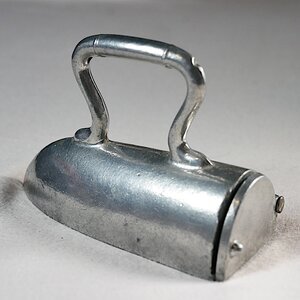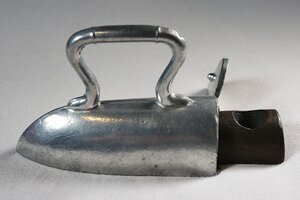 Modell eines Ochsenzungenbügeleisens mit Metallbügel und vorhandenem Eisenkeil. Der Boden besitzt keine Rippen. Die Klappe an der Rückseite mit der der Bolzen am Herausfallen gehindert werden soll, ist am Gelenk leicht beschädigt. Der in der Größe passende Bolzen besitzt am hinteren Ende ein Loch, das zum Hinein- und Herausschieben des Bolzens verwendet werden kann. Das Eisen macht einen neuwertigen, ungebrauchten Eindruck und könnte funktionsfähig sein.