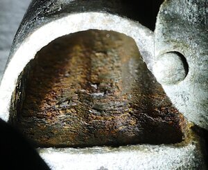 Miniatur-Ochsenzungenbügeleisen aus vernickeltem (verzinktem?) eisen mit einem Holzgriff. Traditionelle Form eines Ochsenzungenbügeleisens mit nur einer Griffstütze. Die Klappe an der Rückseite ist relativ primitiv mit einer Schraube befestigt. Das Bügeleisen besitzt wie normal große Ochsenzungenbügeleisen am Boden 2 Rippen, die den Bolzen von der Oberfläche des Bodens etwas auf Abstand halten. Der im Bügeleisen befindliche Bolzen passt von der Größe her gehört aber nicht original zu diesem Bügeleisen. Das Bügeleisen weist starke Gebrauchsspuren auf die darauf hindeuten, dass das Eisen früher in Benutzung war. Mit einem von der Größe her passenden Bolzen kann es in Betrieb genommen werden. Vielleicht als Spezialeisen oder wahrscheinlicher als Kinderbügeleisen mit dem Mädchen das Bügeln lernen konnten.