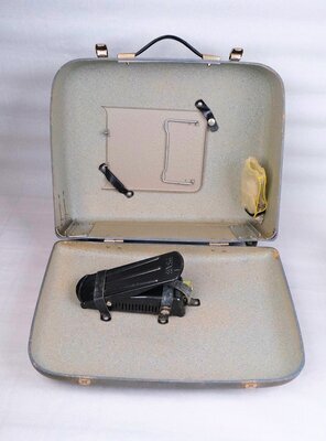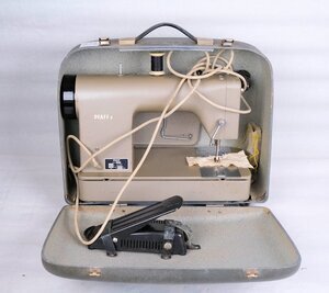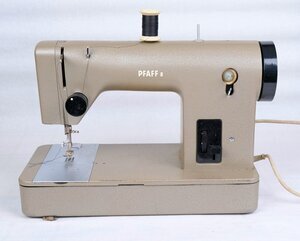 Die Haushaltsnähmaschine Pfaff, Modell 8. geradstich, ist eine gekonnte Symbiose der beiden Hersteller Pfaff und Gritzner. (Die Firma Gritzner, Karlsruhe wurde von Pfaff übernommen). Die stabile Ausführung der Gritzner, gepaart mit der Leichtgängigkeit der Pfaff Modelle. In Fachkreisen wird die Maschine sehr gelobt wegen ihrer stabilen, hochwertigen Bauweise sowie ihrer Langlebigkeit, die auch hohe Belastungen verkraften. (siehe Link) Unser Objekt ist ein tragbares Koffermodell mit eingebautem E-Motor aus dem Jahr 1967. Das gusseiserne Gehäuse hat eine hat eine Sandfarbene Lackierung auf der, sehr dezent, der Firmenname PFAFF sowie die Modellnummer mittels Abziehbilder aufgebracht wurde. Wie auf dem Bild sichtbar, steht die Maschine auf einem Metallsockel, der sich von unten her öffnen lässt. Der Arbeitstisch wird von einer eingebauten Lampe beleuchtet und kann, mit Hilfe einer Verlängerung, um 20 cm vergrößert werden. Maschine, Fußpedal, Kabel, Tischverlängerung und Zubehör sind zusammen in einem stabilen sandfarbenen Kunststoff Koffer untergebracht. Die Maschine macht äußerlich einen guten Eindruck, jedoch sind die verbauten Kondensatoren anfällig, so dass die heutige Funktion möglicherweise beeinträchtigt ist.