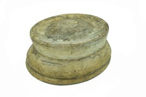 Vintage Miniaturversion eine Blockeisens mit einem (einzigen) Bügelständer aus Messing und dunklem, gedrechselten Holzgriff. Das Bügeleisen hat eher die Form eines Ochsenzugenbügeleisens, aber bietet nicht die Möglichkeit einen Bolzen einzuführen. Es macht einen neuwertigen Eindruck, ist schon alleine auf Grund seiner Winzigkeit nicht benutzbar und dient nur zur Verwendung in der Puppenküche oder zur Dekoration oder in einem Setzkasten.