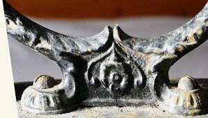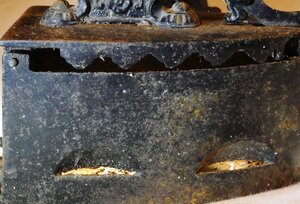 Das Bügeleisen war ehemals mit einem heute verloren gegangenen Holzgriff ausgestattet und besitzt eine mit Einkerbungen und einer Rose verzierte gusseiserne Griffstütze. Diese ist mit Schrauben am Deckel befestigt. Vor der Griffstütze befindet sich ein schneckenförmiger Reibeverschluss mit dem der Deckel verschlossen werden kann. An allen drei Seiten des Bügeleisens befinden sich insgesamt fünf "Augen", d.h. heißt augenförmige Löcher zur Ermöglichung der Luftzirkulation bei der brennenden Holzkohle. Das Bügeleisen befindet sich in einem eher schlechten Zustand. Leider keine Informationen zum Hersteller. Das vorliegende Bügeleisen ist ein sogenanntes Augeneisen. Augeneisen wurden seit etwa 1870 hergestellt und sind die Weiterentwicklung eines sogenanntes Kohleneisen. Die Augen dienen zur Verbesserung der Luftzufuhr. Kohleisen sind ein Bügeleisen aus Eisen mit nach hinten aufklappbarem Deckel mit Holzgriff. In den aufklappbaren Deckel eines Kohleneisens konnte glühende (Holz-)Kohlenasche eingefüllt werden. Die Bügelsohle besteht aus dickem Eisenblech, der Kohlebehälter besteht aus dünnerem Eisen. Die Bügelsohle ragt in hinteren Teil über den Kohlebehälter heraus. Mit einer Klappe auf der Rückseiten, unten über der Bügelsohle, konnte Asche ausgeschüttet werden. Der Rost nicht vorhanden, ebenso der hölzerne Griff.