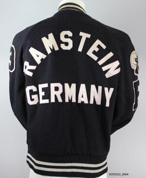 Sogenannte „Letter Jacket“ des Ramstein Rams Varsity Team, also der Schulmannschaft. Langärmelige, einfarbige Jacke, Footballjacke, an Baseball-Kragen, Ärmeln und unten mit gestreiftem Strickbündchen abgesetzt, wattiert, Einschubtaschen, weiß abgesetzt und weiße Druckknöpfe. Zahlreiche Aufnäher, vorne, an beiden Ärmeln oben und hinten. Beschriftung: Vorderseite: Glen; R Rückseite: RAMSTEIN GERMANY