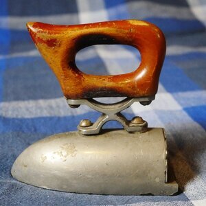 Miniatur-Ochsenzungenbügeleisen aus vernickeltem (verchromten) Eisenblech mit einem ausladenden Holzgriff. Der Griff mit einem großen Loch zum reingreifen ist mit Schrauben auf einer Griffstütze und diese wieder mit Schrauben auf dem eigentlichen Eisen befestigt. Die Klappe an der Rückseite ist relativ primitiv mit einer Schraube befestigt. Das Bügeleisen besitzt wie normal große Ochsenzungenbügeleisen am Boden 2 Rippen, die den Bolzen von der Oberfläche des Bodens etwas auf Abstand halten. Der Bolzen ist leider nicht erhalten. Das Bügeleisen weist leichte Gebrauchsspuren auf die darauf hindeuten könnten, dass das Eisen früher in Benutzung war. Mit einem von der Größe her passenden Bolzen kann es in Betrieb genommen werden. Vielleicht als Spezialeisen oder wahrscheinlicher als Kinderbügeleisen mit dem Mädchen das Bügeln lernen konnten.