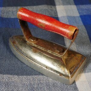 Kinderbügeleisen mit einer Kuppel in der Form eines frühen Elektrobügeleisens (ohne Thermostat). Der rote Griff ist mit Schrauben an eine Bügelstütze angeschraubt und diese mit Schrauben an der Kuppel. Kinderspielzeug, das nicht dazu gedacht ist erhitzt zu werden.