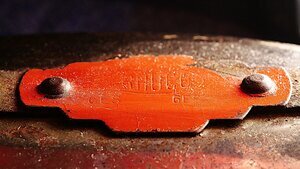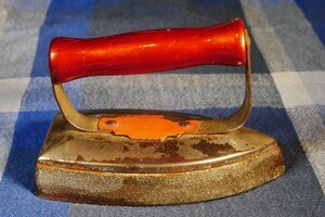 Kinder Bügeleisen mit Herstellerlogo. Das Bügeleisen ist in der Form einer Kuppel und somit in der Form eines frühen Elektrobügeleisens (ohne Thermostat). Der rote Griff ist mit Nägeln an eine Bügelstütze angeschraubt und diese mit Nieten an der Kuppel. Kinderspielzeug, das nicht dazu gedacht ist erhitzt zu werden. Über dem unteren Teil der Bügelstütze befindet sich ein Plakette mit den Herstellerangaben. Auf dieser steht der Firmenname (und/oder Markenname) RAUCO und darunter GES. GESCH. Leider waren über den Hersteller keine weiteren Informationen herauszufinden.