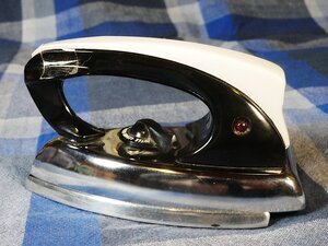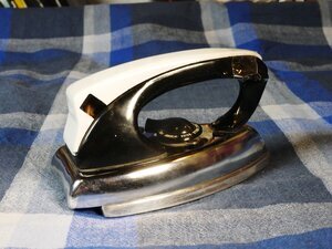 Bügeleisen werden seit dem 17. Jahrhundert zum Glätten der Wäsche verwendet. Die ersten Bügeleisen bestanden aus einer Metallplatte und einem bügelartigen Holzgriff. Daher auch der Name. Mit der Elektrifizierung der Haushalte setzten sich Elektrobügeleisen mehr und mehr durch. Das Reisebügeleisen aus dem Hause Severin besitzt einen großen schwarz-weißen Griff aus Kunststoff. Der darunterliegende Heizkörper besteht aus vernickeltem Eisen. In den Griff integriert ist ein Thermostat, ein schwarzer Drehregler mit weiser Schrift mit dem die Höchsttemperatur für die jeweilige Stoffsorte eingestellt werden konnte. Auf dem Drehregler werden die Hitzestufen mit folgenden Namen beschrieben: "HITZE LEINEN B'WOLLE WOLLE SEIDE K'SEIDE AUS" Seitlich am Griff befindet sich eine Warnleuchte, die aufleuchtet, wenn das Bügeleisen aufheizt. Fest in den Griff integriert ist ein Anschlusskabel, das an diesem befestigt ist. Es wird direkt am Bügeleisen durch eine rote Kunststoffhülle verstärkt, ist mit einem mit schwarz-weißem Muster gemustertem Textilmantel isoliert und besitzt an seinem Ende einen schwarzen Schukostecker. An der Unterseite befindet sich die Beschriftung: 110-220V A.C. Wechselstrom WESTERN GERMANY. Auf der Rückseite des Griffs befindet sich das Logo der Firma Severin. Das Bügeleisen ist defekt. Das Anschlusskabel wurde entfernt.