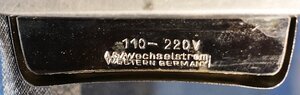 Bügeleisen werden seit dem 17. Jahrhundert zum Glätten der Wäsche verwendet. Die ersten Bügeleisen bestanden aus einer Metallplatte und einem bügelartigen Holzgriff. Daher auch der Name. Mit der Elektrifizierung der Haushalte setzten sich Elektrobügeleisen mehr und mehr durch. Das Reisebügeleisen aus dem Hause Severin besitzt einen großen schwarz-weißen Griff aus Kunststoff. Der darunterliegende Heizkörper besteht aus vernickeltem Eisen. In den Griff integriert ist ein Thermostat, ein schwarzer Drehregler mit weiser Schrift mit dem die Höchsttemperatur für die jeweilige Stoffsorte eingestellt werden konnte. Auf dem Drehregler werden die Hitzestufen mit folgenden Namen beschrieben: "HITZE LEINEN B'WOLLE WOLLE SEIDE K'SEIDE AUS" Seitlich am Griff befindet sich eine Warnleuchte, die aufleuchtet, wenn das Bügeleisen aufheizt. Fest in den Griff integriert ist ein Anschlusskabel, das an diesem befestigt ist. Es wird direkt am Bügeleisen durch eine rote Kunststoffhülle verstärkt, ist mit einem mit schwarz-weißem Muster gemustertem Textilmantel isoliert und besitzt an seinem Ende einen schwarzen Schukostecker. An der Unterseite befindet sich die Beschriftung: 110-220V A.C. Wechselstrom WESTERN GERMANY. Auf der Rückseite des Griffs befindet sich das Logo der Firma Severin. Das Bügeleisen ist defekt. Das Anschlusskabel wurde entfernt.