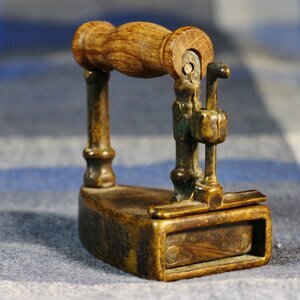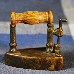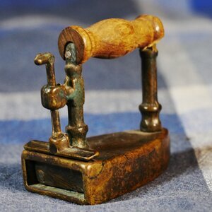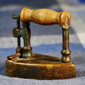 Miniatur Flachbolzenbügeleisen (Kastenbügeleisen, Reisebügeleisen) aus Messing mit schiffförmigem Rumpf. In den Rumpf kann ein erhitzter Bolzen von hinten eingeführt werden. Mit diesem wird der Boden des Bügeleisens erhitzt. Der Innenraum kann mit einem von oben eingeführten Schieber mit Stiel und Griff verschlossen werden, sodass der Eisenkeil nicht nach hinten herausfallen kann. Hierzu befindet sich am hinteren breiten Ende die Schiebeklappe, die vertikal beweglich ist, um den heißen Bolzen einführen zu können. Der hölzerne Griff ist mit 2 relativ langen und unten verzierten Säulen aus Messing mit dem eigentlichen Bügeleisen unten mit Schrauben verbunden. Ein Bolzen ist nicht vorhanden. Das Holz des Griffs ist nachgedunkelt. Das Objekt zeigt viel Patina. Es liegt die Vermutung nahe, dass diese absichtlich aufgetragen wurde um das Bügeleisen alt erscheinen zu lassen. Das Objekt ist wohl als reines Deko-Objekt oder für die Puppenküche verkauft und dort benutzt worden.