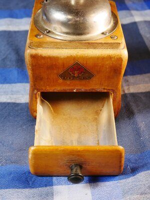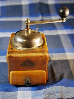 Die unterstellige Kaffeemühle Modell 558 mit innenliegender Mahlgradverstellung wurde von der Firma PeDe Dienes in Remscheid hergestellt. Sie besteht aus einem Korpus aus Kirschholz mit einer Kunststoffschublade für den gemahlenen Kaffee und einem unterstelligem Mahlwerk, das mit einer Kurbel angetrieben wird. Oben befindet sich in der vernickelten Kuppel ein Doppelschiebedeckel zum Einfüllen der Kaffeebohnen. Diese fallen in einen weiß lackierten Stahlblechtrichter und nach dem Mahlvorgang in die Schublade. Auf der Kurbel ist der Firmenname angebracht. Auf der Vorderseite ist ein Aufkleber mit dem Firmennamen, dem Logo mit Hirsch.