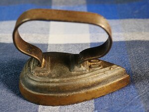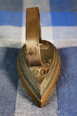 Flacheisen in Herzform (auch Harzer Form genannt) mit angegossenem Bandeisengriff und kanneliertem Rand. Keine Angaben zum Hersteller. Bügel in der rheinischen Form. Zwischen der vordere Bügelstütze und der Spitze des Bügeleisens befinden sich die Zahlen 0 0 . Wahrscheinlich die Größenangabe oder die Modellnummer. Es ist ein einfaches kleines Flacheisen, das auf der Herdplatte oder an einem Bügeleisenofen erhitzt werden musste. Unten an dem Bügeleisen befindet sich in gleicher Größe und Ausformung eine Sohle aus Messing. Aufgrund der im Vergleich zu Eisen geringeren Wärmekapazität von Messing ist anzunehmen, dass dies Sohle erst später als das Eisen rein zu Dekorationszwecken genutzt wurde hinzugekommen ist.
