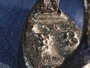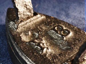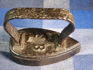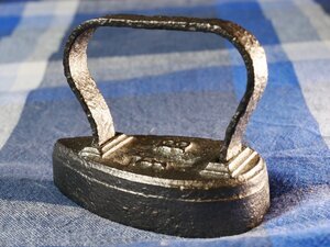 Flacheisen in Herzform (auch Harzer Form genannt) mit angegossenem Bandeisengriff und kanneliertem Rand. Keine Angaben zum Hersteller. Bügel in der rheinischen Form. Zwischen den Bügelstützen befindet sich erhaben die Buchstaben F und B . Das "Bügeleisen" ist ein ziemlich grober auf rustikal gemachter und insgesamt schlechter Nachguss eines Flacheisens von dem wir auch mit Inventarnummer HR 494 einen originalen Guss in unserer Sammlung haben. Es ist auch aufgrund des welligen Bodens nur als Deko und nicht zum Bügeln geeignet. Es ist ein einfaches kleines Flacheisen, das auf der Herdplatte oder an einem Bügeleisenofen erhitzt werden musste.