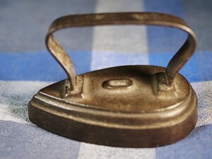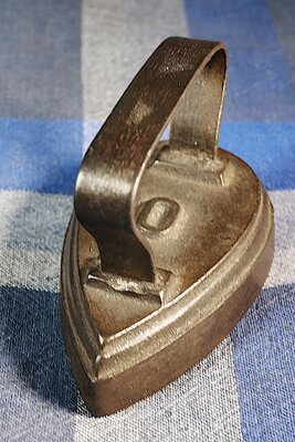 Flacheisen in Herzform (auch Harzer Form genannt) mit angegossenem Bandeisengriff und kanneliertem Rand. Keine Angaben zum Hersteller. Bügel in der rheinischen Form. Zwischen den Bügelstützen befinden sich erhaben die Ziffer 0. Wahrscheinlich eine Größenangabe. Die Sohle unten an dem Bügeleisen ist wohl erst später dazugefügt worden. Sie ist vielleicht aus Bleibronze (?). Es ist ein einfaches kleines Flacheisen, das auf der Herdplatte oder an einem Bügeleisenofen erhitzt werden musste. Aufgrund der Sohle könnte es ein Nachguss sein.