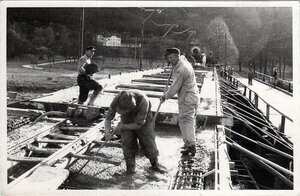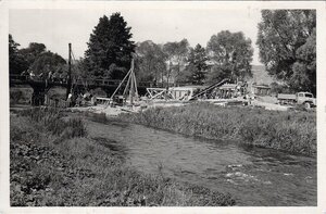 Schwarz-weiß Fotografie der Pionierbrücke, die 1940 durch das Bataillon 211 unter dem Kommandeur Major Rothe gebaut wurde. Trotz strengen Winters und Hochwassers bauten sie neben dem Fußgängersteg eine 72 Meter lange und 4 Meter breite befahrbare Holzbrücke. Über die Brücke gehen im Bild zwei Pioniersoldaten von der Dorfseite zum Kurgebiet. Das Batallion gehörte zur 211. Infanterie-Division und war im Bodendorf/Ahr 1939/1940 einquartiert.
