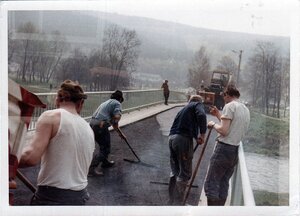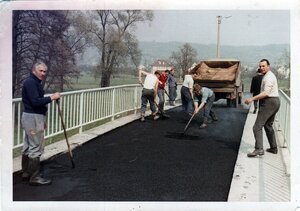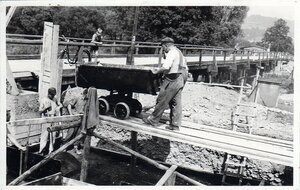 Schwarz-weiß Fotografie der Pionierbrücke, die 1940 durch das Bataillon 211 unter dem Kommandeur Major Rothe gebaut wurde. Trotz strengen Winters und Hochwassers bauten sie neben dem Fußgängersteg eine 72 Meter lange und 4 Meter breite befahrbare Holzbrücke. Über die Brücke gehen im Bild zwei Pioniersoldaten von der Dorfseite zum Kurgebiet. Das Batallion gehörte zur 211. Infanterie-Division und war im Bodendorf/Ahr 1939/1940 einquartiert.
