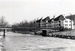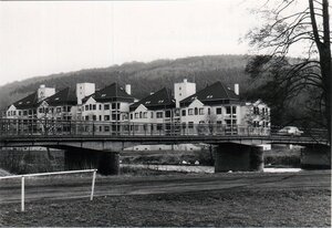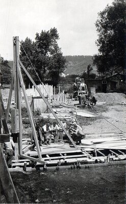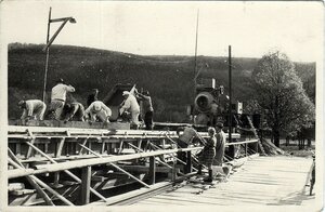 Da die hölzerne Pionierbrücke von 1940 über die Ahr nicht mehr den Anforderungen entsprach und baufällig wurde begann 1952 Bau einer einspurigen Betonbrücke über die Ahr. Die Bilder der Bauphase sind alle in schwarz-weiß fotografiert 1809_B_2-12-#1 Bau einer neuen Betonstahl-Brücke, Ende August 1952. Hier werden die Spundwände für deinen Brückenpfeiler ins Ahrufer gerammt. Oben links im Bild die Bauhütte. Um vor Einbruch der Winterkälte fertig zu werden, arbeitete man zum Teil in Tag und Nachtschicht. Schon Anfang November stand neben der alten Pionierbrücke der fertige Rohbau der neuen Brücke. 1809_B_2-12-#2 Bau einer neuen Betonstahl-Brücke, Ende August 1952. Hier werden die Spundwände für deinen Brückenpfeiler ins Ahrufer gerammt. Dahinter links im Bild der fertig betonierte Brückenkopf. Um vor Einbruch der Winterkälte fertig zu werden, arbeitete man zum Teil in Tag und Nachtschicht. Schon Anfang November stand neben der alten Pionierbrücke der fertige Rohbau der neuen Brücke. 1809_B_2-12-#3 Bau einer neuen Betonstahl-Brücke, Ende August 1952. Hier werden die Spundwände für die Brückenpfeiler ins Ahrufer gerammt. Auf der alten hölzernen Pionierbrücke betrachten Leute die Arbeiten. 1809_B_2-12-#4 Bau einer neuen Betonstahl-Brücke, Ende August 1952. Hier werden die Spundwände für die Brückenpfeiler ins Ahrufer gerammt. Auf der alten hölzernen Pionierbrücke betrachten Leute die Arbeiten. 1809_B_2-12-#5 Bau einer neuen Betonstahl-Brücke, Ende August 1952. Hier werden die Fundamente für die Brückenpfeiler ins Ahrufer gegraben. 1809_B_2-12-#6 Einbau der Armierung für die neuen Brückenfahrbahn. Links im Bild die alte Holzbrücke. 1809_B_2-12-#7 Betonieren der neuen Fahrbahn. Im Vordergrund stehen auf der alten hölzernen Brücke ein Paar mit Hund. 1809_B_2-12-#8 Ein Arbeiten fährt mit einer Lore Beton an den Arbeitsplatz. 1809_B_2-12-#9 Der Beton wirde auf der Fahrbahn verteilt. Rechts im Bild Personen auf der alten Holzbrücke. 1809_B_2-12-#10 Asphalt für die Fahrbahn wird auf der Brücke verteilt. Hire kann man gut erkennen wie schmal die Fahrbahn und die Gehwege waren. 1809_B_2-12-#11 Die fertige einspurige Freiherr vom Stein-Brücke 1953. Im Hintergrund der fertige Wohnpark Ahr im Kurgebiet. 1809_B_2-12-#12 Die fertige einspurige Freiherr vom Stein-Brücke 1953. Vorn links Geländer/Abgrenzung vom Fußballplatz. Im Hintergrund der fertige Wohnpark Ahr im Kurgebiet. 1809_B_2-12-#13 Die fertige einspurige Freiherr vom Stein-Brücke 1953 mit einem Auto, welches ins Kurgebiet fährt. Im Hintergrund der fertige Wohnpark Ahr im Kurgebiet.