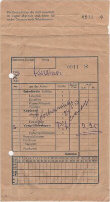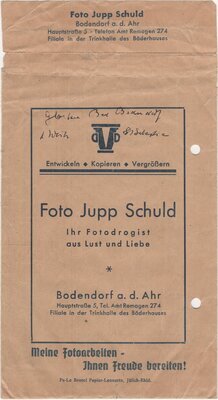 Aus braunen Papier hergestellte Fototüte, in der entwickelte Fotoaufnahmen vom Fotodrogisten Jupp Schuld an den Kunden ausgeliefert wurden. In der vorliegenden Fototüte bekam Hauptlehrer Kollbeck drei Vergrößerungen ausgeliefert.