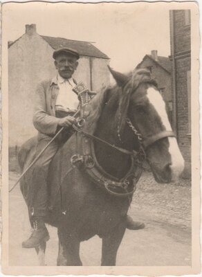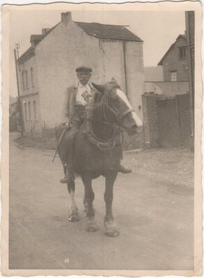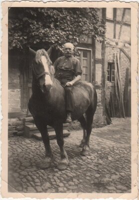 Schwarzweiß Fotografien, die Adem Deller in verschiedenen Aktionen zeigen. 1000_B_2-14-#1 Adam Deller reitet auf Ackergaul, August 1949, Fotograf Jupp Schuld (Fotogröße 101 x 73 mm) 1000_B_2-14-#2 Adam Deller reitet auf Ackergaul, August 1949, Fotograf Jupp Schuld (Fotogröße 101 x 73 mm) 1000_B_2-14-#3 Adam Deller reitet auf Ackergaul, August 1952, Fotograf Photo-Druck Ewat (Fotogröße 89 x 62 mm) 1000_B_2-14-#4 Adam Deller führt zwei Kühe vom Feld, Fotograf unbekannt, (Fotogröße 124 x 84 mm) 1000_B_2-14-#5 Adam Deller mit einer am Arbeitsochsen angehangenen Holzegge , Fotograf unbekannt, (Fotogröße 82 x 112 mm)