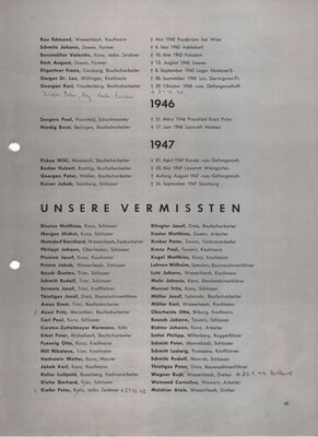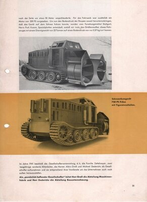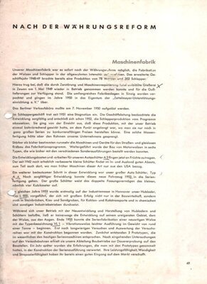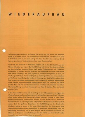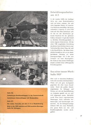 10 Lose Blätter, die Teil einer umfangreicheren Broschüre im DIN A4 Format waren. Darin wird die Entwicklung der Firmengeschichte ab der Mitte der 1930er Jahre bis zum Ende der 1950er Jahre beschrieben. Es wird, teils illustriert, über Dieselschlepper, Entwicklungen von Auto Schüttern genauso berichtet wie über die Firmen-Situation im Krieg bis zum Wiederaufbau in den 1950er Jahren. Ein extra Bericht ist einem Schneeräumgerät gewidmet, dass die Maschinenfabrik Zettelmeyer 1943, im Auftrag vom Generalinspekteur für das Deutsche Straßenwesen, entwickeln sollte. Das Räumgerät sollte eine 750 PS Fräse sein, hergestellt aus Einzelteilen vom Tiger-Panzer (S 34/35) Desweiteren sind Informationen zu Absatzmärkten und Berichte zu namhaften Persönlichkeiten wie dem späteren Gesellschafters Albin Groß, enthalten. Eine vierseitige Namensliste von Gefallenen, Verstorbenen oder als vermisst geltenden Beschäftigten des Unternehmens, ist am Ende abgedruckt. Ergänzt sind die Namensangaben durch ihre Berufsbezeichnungen, Sterbedaten und Sterbeorte.