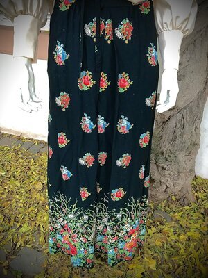 Hellbeige Polyesterbluse mit langen Armen und Schwalbenschwanzkragen. An den hohen Manschetten und der kurzen Knopfleise im Brustbereich Strassknöpfe. Schwarzer, gefütterter, bodenlanger leicht ausgestellter Rock mit auffälligem buntem Blumenmuster, seitlichen Eingriffstaschen und Kellerfalten.