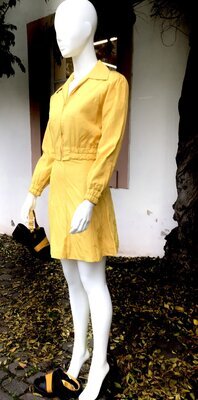 Ensemble, 3-teilig, sonnengelber Viskosemix - leicht ausgestellter, gefütterter Minirock mit seitlichem Reißverschluß - Schlaghose mit Bügelfalte und fixiertem Beinumschlag - kurzes, gefüttertes Bomberjäckchen mit Reißverschluß und Reverskragen, geraffte Bündchen an Saum und Ärmeln