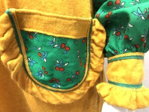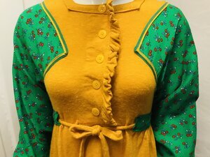 Ausgefallenes, sonnengelbes Minikleid mit langen, grüngemusterten Ärmeln, zwei aufgesetzten Taschen, Bindegürtel, angedeuteter Knopfleiste und Reißverschluß am Rücken. Rüschenbesatz an Knopfleiste, Taschen und Ärmelbündchen.